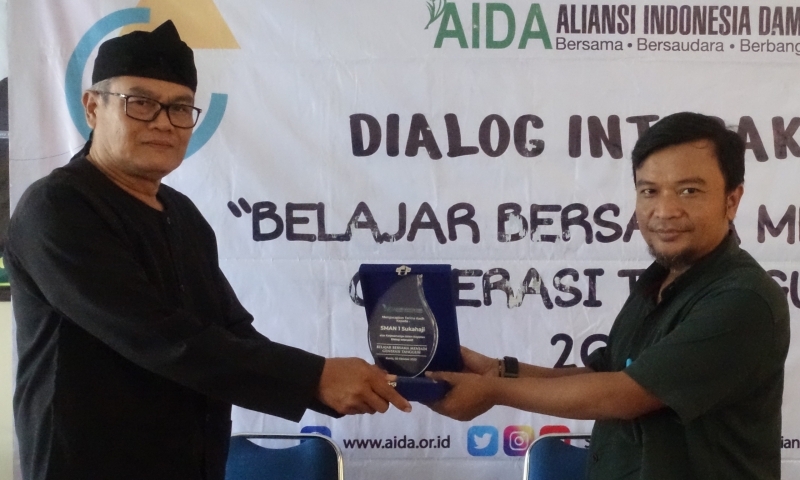 Ketua Pengurus Aliansi Indonesia Damai (AIDA) Hasibullah Satrawi menyerahkan cendera mata kepada pimpinan SMAN 1 Sukahaji Majalengka. "Tanda bahwa AIDA sudah sampai di sekolah tercinta ini," katanya yang disambut ucapan terima kasih oleh pihak sekolah. Hal itu disampaikan pada sesi pembukaan kegiatan Dialog Interaktif “Belajar Bersama Menjadi Generasi Tangguh” pada Kamis (05/10/2023).