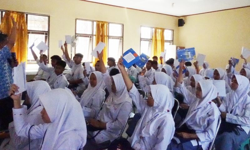 Fasilitator kegiatan, Agus Muhammad, memandu sesi pengantar kegiatan Dialog Interaktif “Belajar Bersama Menjadi Generasi Tangguh” di SMAN 1 Sukahaji Majalengka, Kamis (05/10/2023). Agus meminta peserta untuk menuliskan tempat-tempat yang paling disukai di kota Majalengka, orang atau sosok yang paling disayangi, dan anggota tubuh yang terkait dengan hobi mereka. Setelah mencatat, peserta berlomba untuk menjawab dengan mengacungkan tangan.