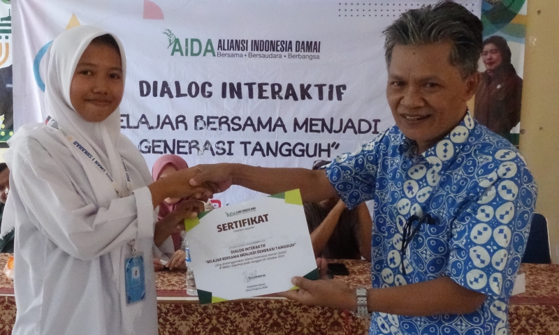 Fasilitator kegiatan Dialog Interaktif “Belajar Bersama Menjadi Generasi Tangguh” di SMAN 1 Sukahaji Majalengka (Kamis, 05/10/2023), Agus Muhammad, menyerahkan sertifikat kepada perwakilan pengurus OSIS. "Ini adalah tanda bahwa adik-adik, teman-teman semua sudah resmi menjadi duta perdamaian, menjadi generasi tangguh dan pelopor perdamaian di Indonesia," pesan Agus kepada para peserta yang disambut dengan tepuk tangan seluruh peserta.