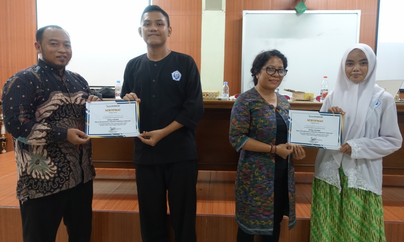Iswanto, mantan pelaku ekstremisme kekerasan (paling kiri), dan Ni Luh Erniati, korban Bom Bali 2002 (kedua dari kanan), keduanya narasumber kegiatan, menyerahkan sertifikat duta perdamaian kepada perwakilan OSIS dan MPK dalam Dialog Interaktif “Belajar Bersama Menjadi Generasi Tangguh” di SMAN 5 Bogor (Rabu, 15/11/2023). "Kami harap setelah mengikuti kegiatan ini, adik-adik dan rekan-rekan semua menjadi generasi tangguh dan pelopor perdamaian di Indonesia," pesan Ni Luh kepada para peserta.