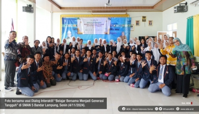 Aliansi Indonesia Damai- Awal November lalu, AIDA mengunjungi lima SMA negeri Kota Tapis Berseri, Bandar Lampung. AIDA menyapa generasi muda dan mengajak mereka untuk bersama-sama menyongsong masa depan Indonesia yang lebih damai. Salah satu sekolah yang dikunjungi yaitu SMAN 5 Bandar Lampung. Acara dikemas dalam bentuk Dialog Interaktif “Belajar Bersama…